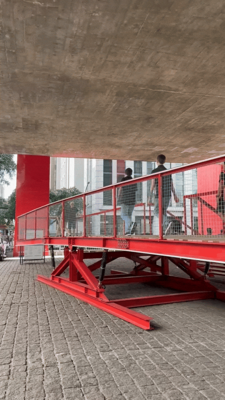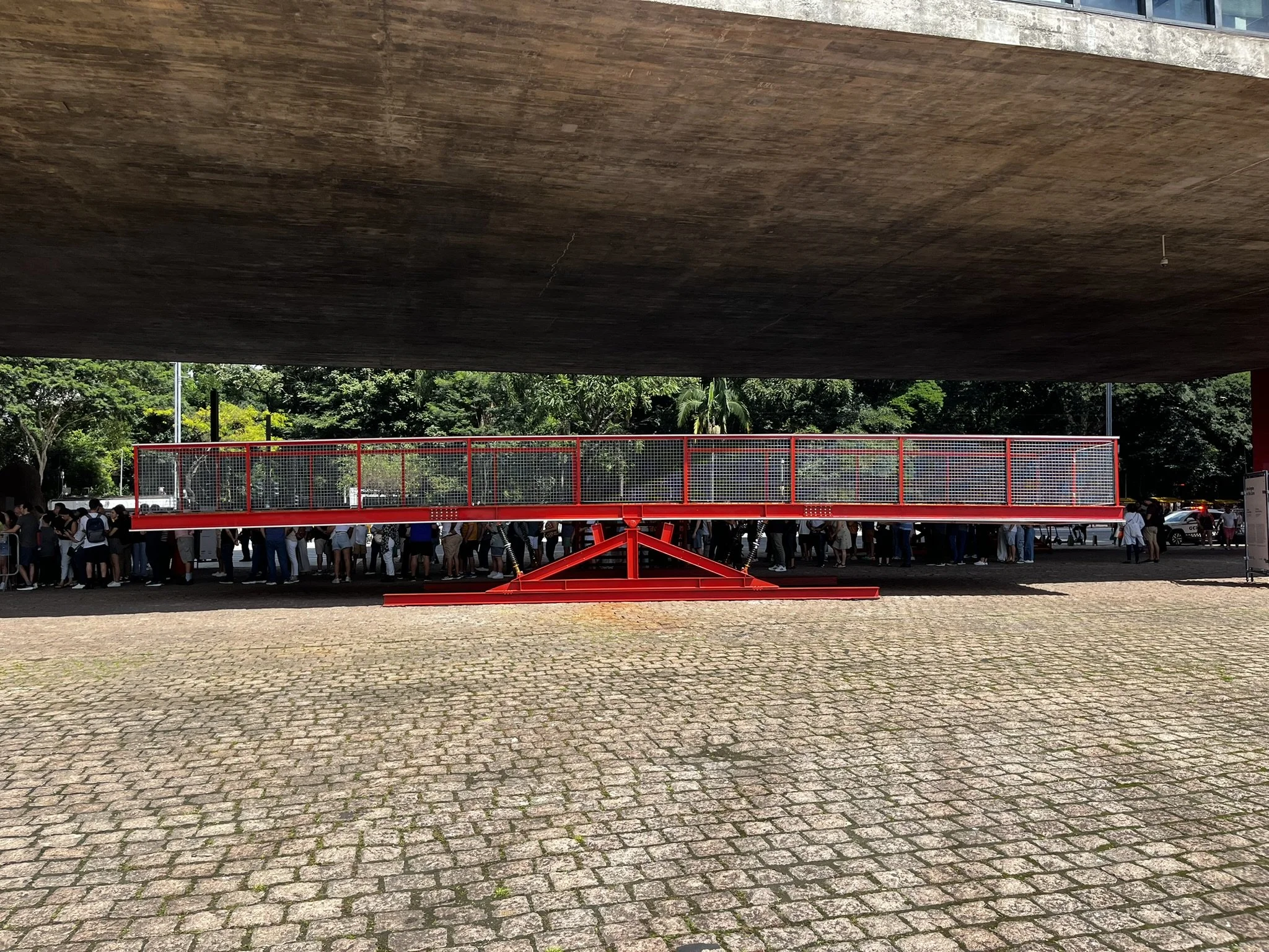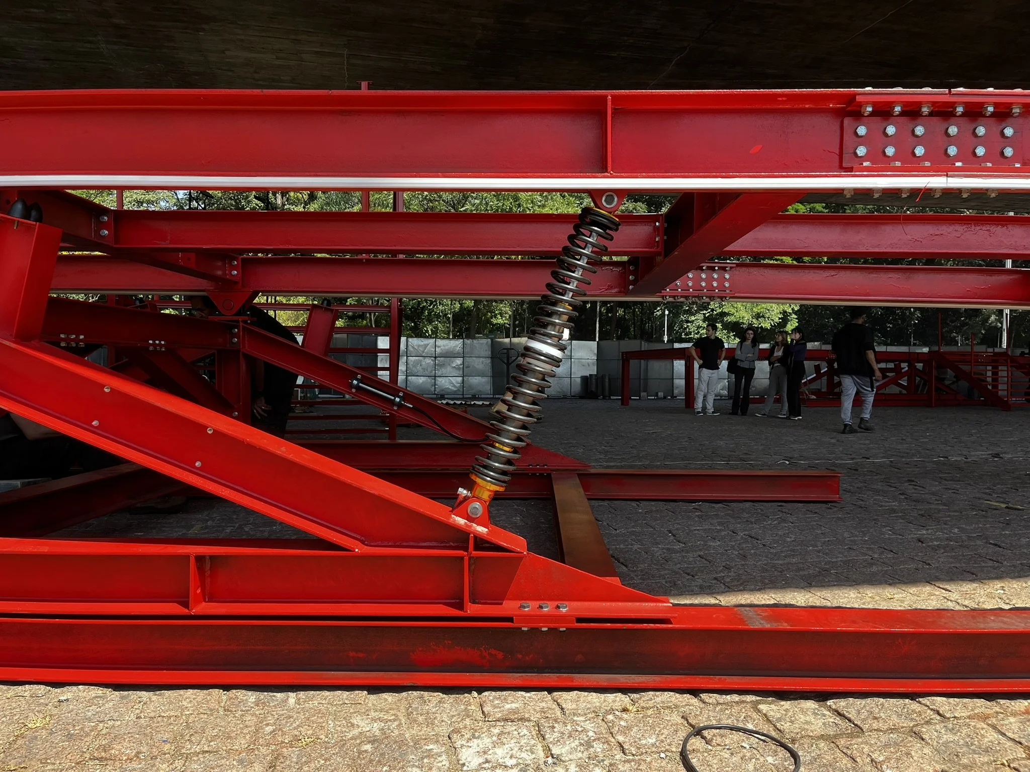 A solução estrutural para a base da gangorra busca discretizar cargas e reduzir vibrações, evitando danos à estrutura do MASP e mantendo a linguagem da obra. A estrutura metálica é composta por vigas longitudinais e transversais em perfil W150x29,8, com apoios elastoméricos e chapas metálicas para integração. Para compatibilizar a altura com os degraus de acesso, foram adotadas placas de neoprene e chapas metálicas, totalizando 180mm.