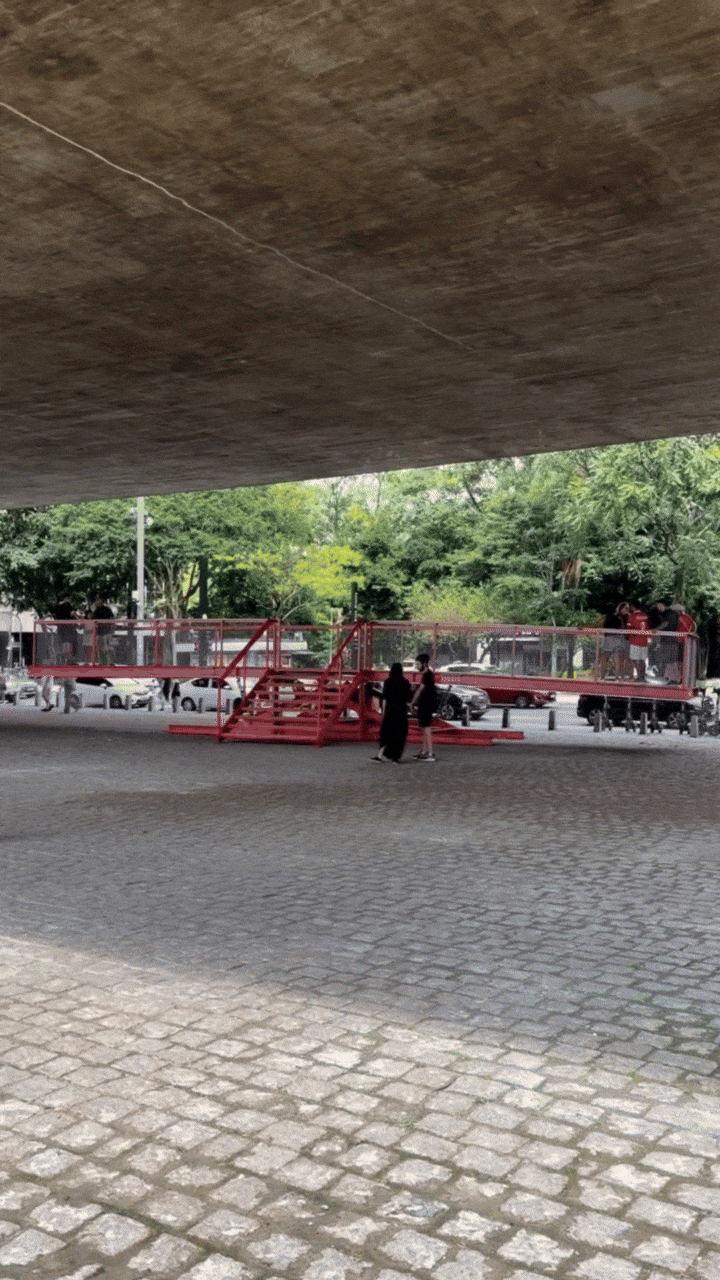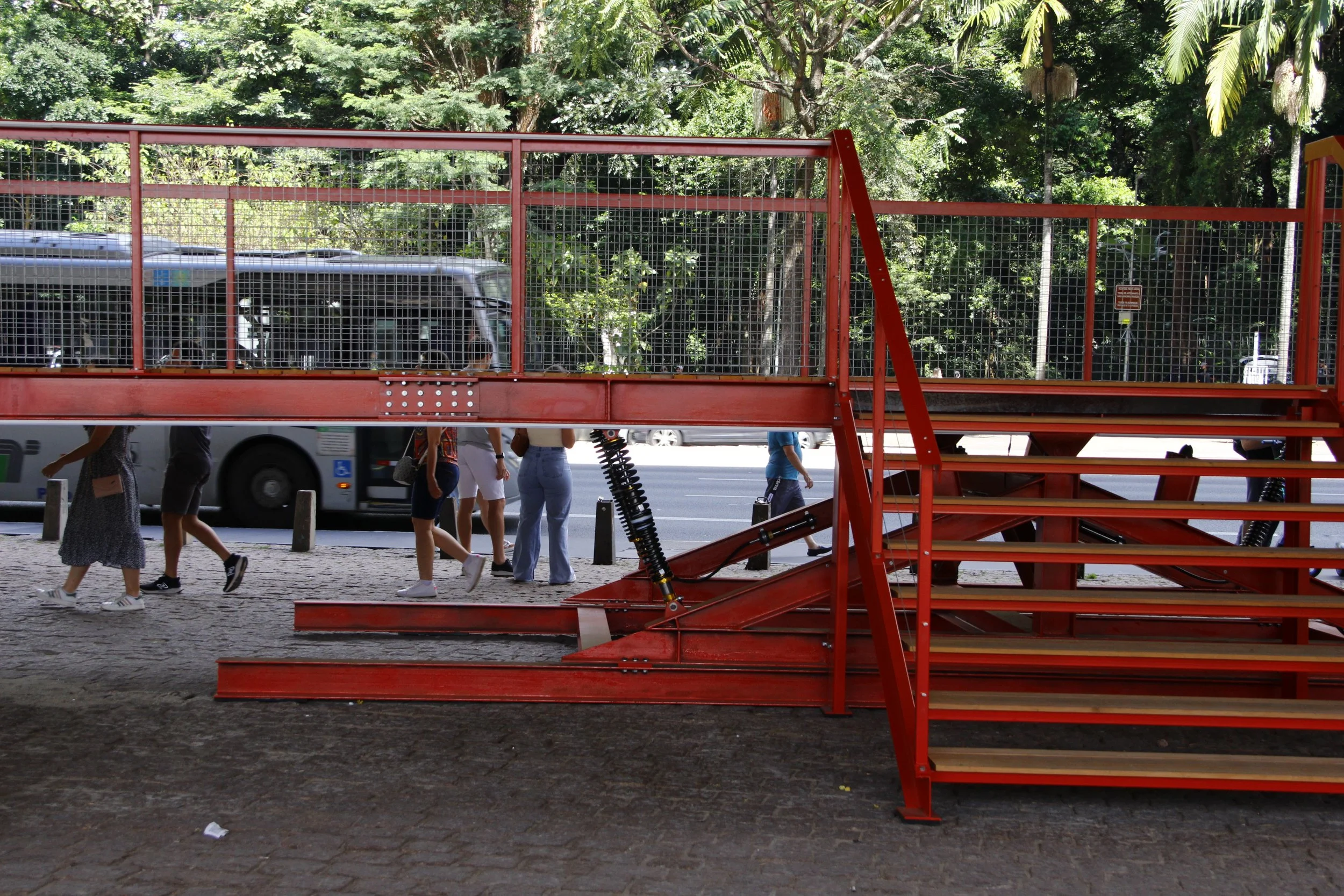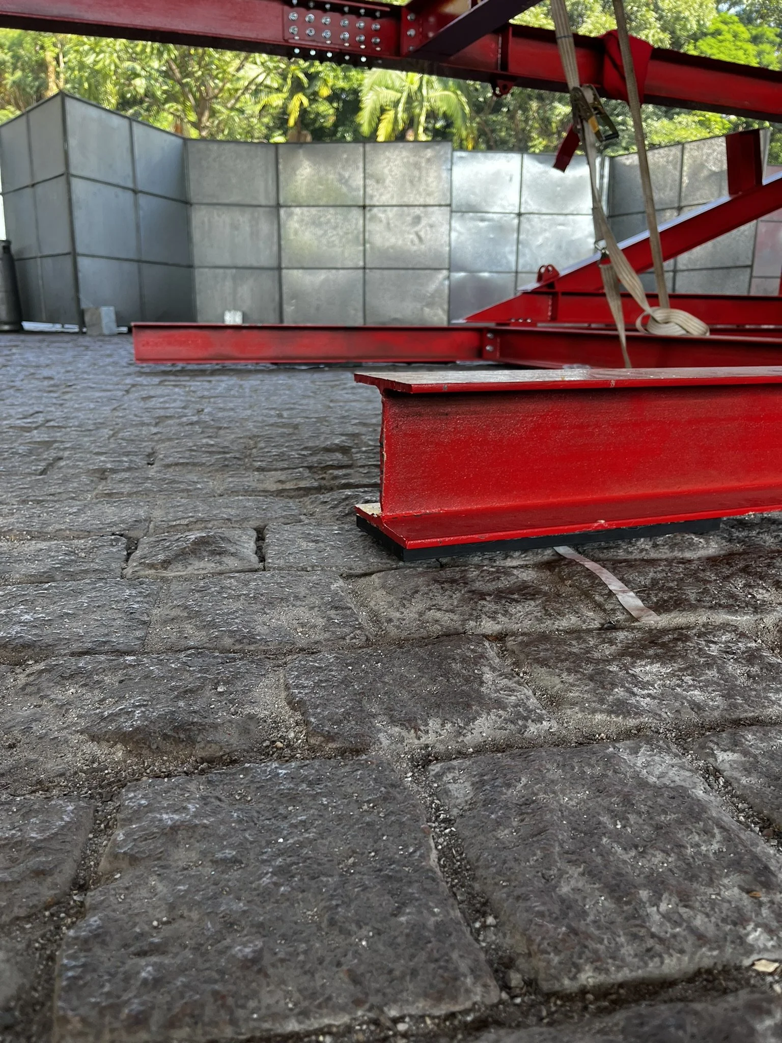 A solução estrutural para a base da gangorra busca discretizar cargas e reduzir vibrações, evitando danos à estrutura do MASP e mantendo a linguagem da obra. A estrutura metálica é composta por vigas longitudinais e transversais em perfil W150x29,8, com apoios elastoméricos e chapas metálicas para integração. Para compatibilizar a altura com os degraus de acesso, foram adotadas placas de neoprene e chapas metálicas, totalizando 180mm.