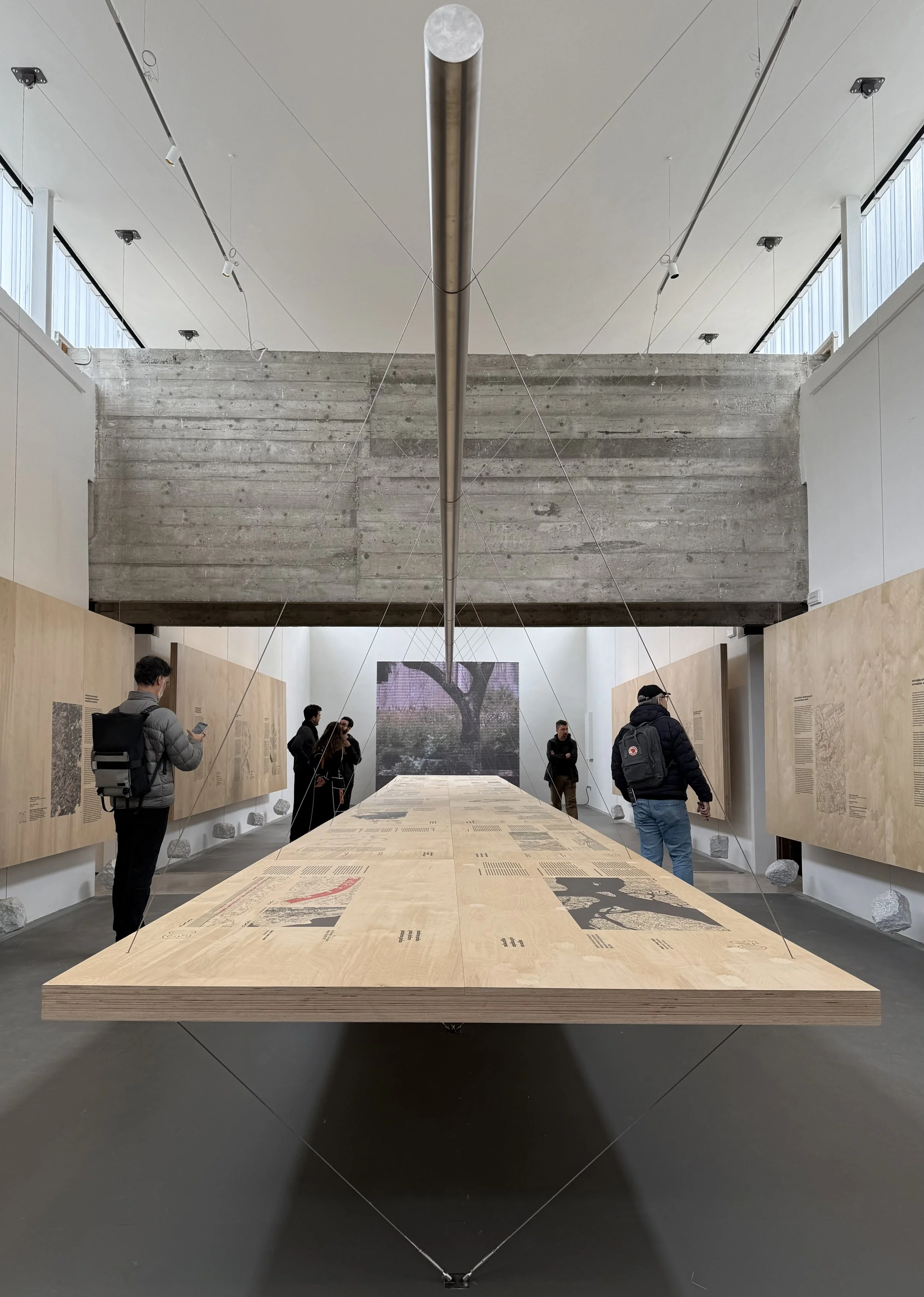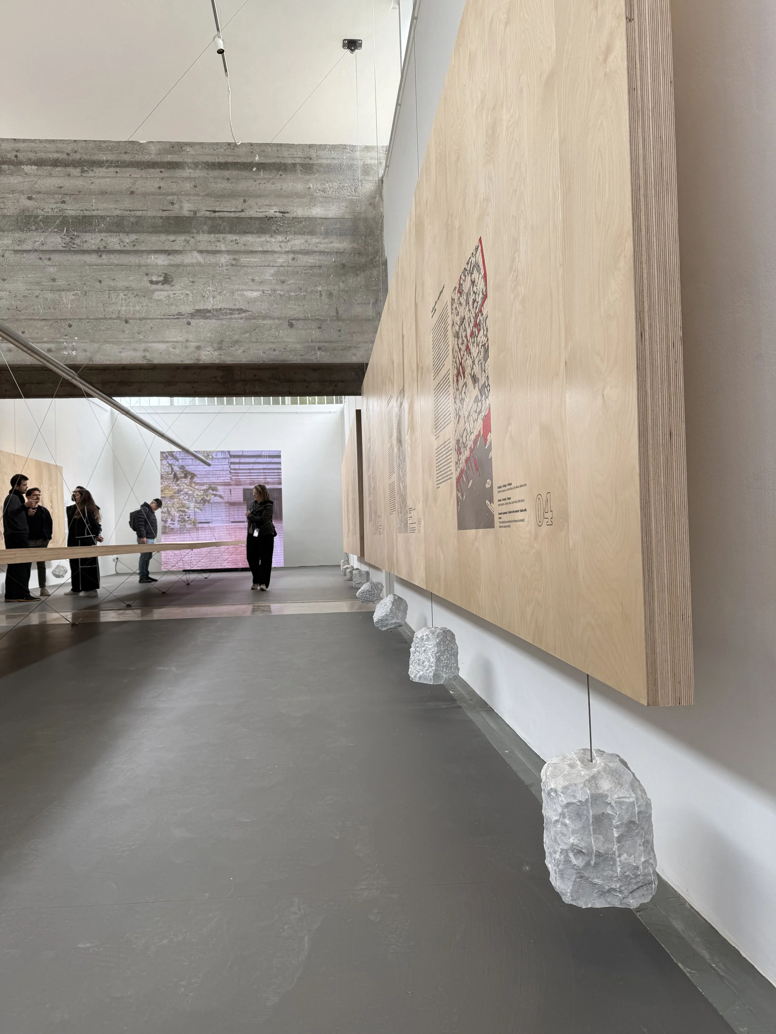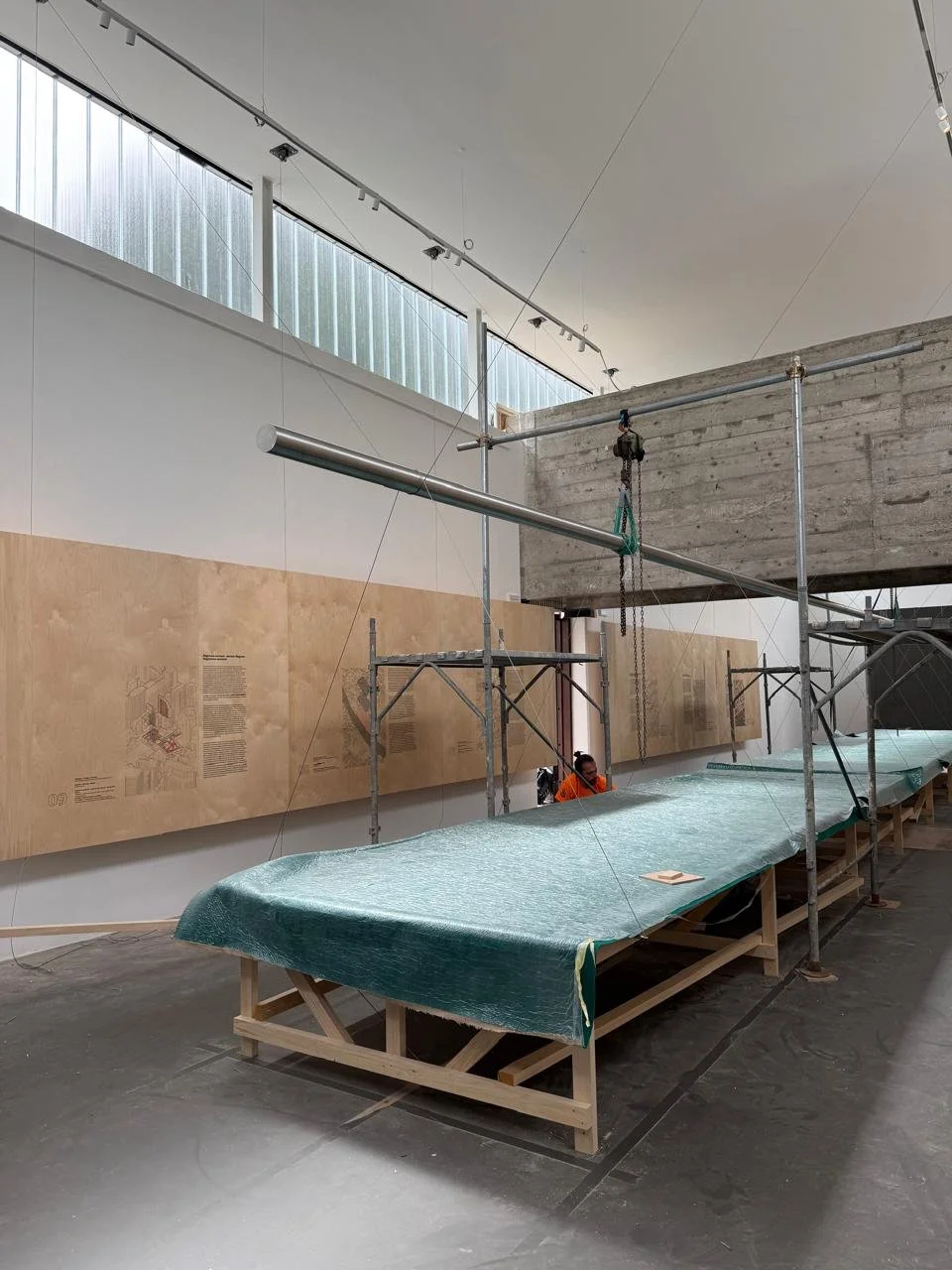 Estrutura expositiva em CLT para o Pavilhão do Brasil, composta por módulos que se repetem a cada 1,80m. Painéis verticais e mesa são interligados por cabos de aço tracionados, com blocos de pedra como contrapeso. A estabilidade é garantida por um sistema de polias e alças que distribui e equilibra as forças. Mais que suporte, a estrutura revela uma coreografia de tração e compressão que dá forma, função e fluidez ao espaço expositivo.