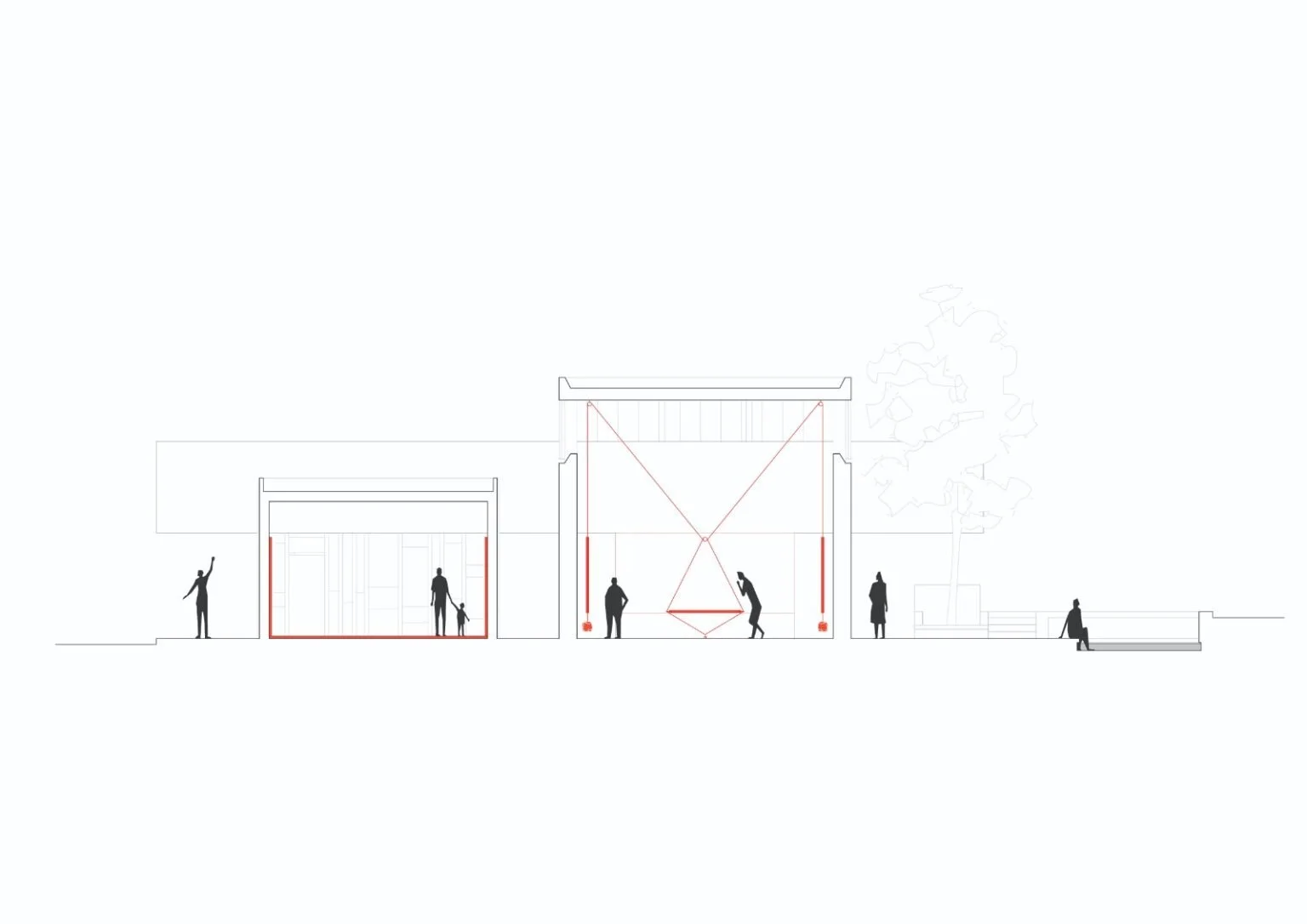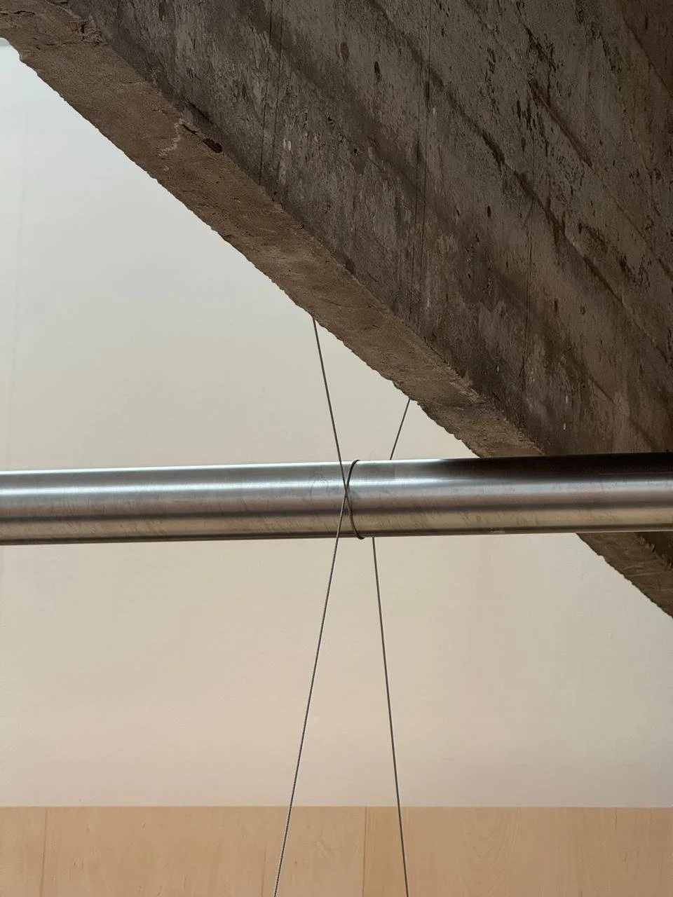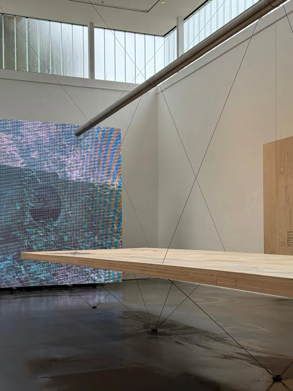 Estrutura expositiva em CLT para o Pavilhão do Brasil, composta por módulos que se repetem a cada 1,80m. Painéis verticais e mesa são interligados por cabos de aço tracionados, com blocos de pedra como contrapeso. A estabilidade é garantida por um sistema de polias e alças que distribui e equilibra as forças. Mais que suporte, a estrutura revela uma coreografia de tração e compressão que dá forma, função e fluidez ao espaço expositivo.