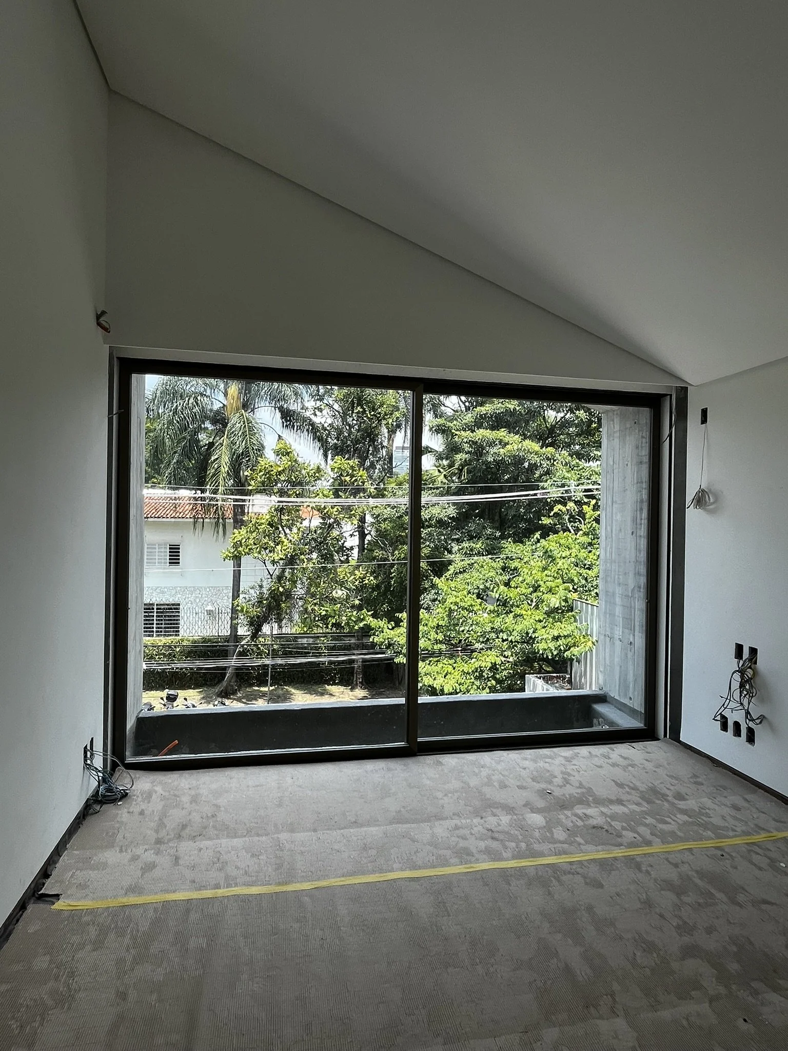 Residência de dois pavimentos com subsolo, destacando volumes em balanço, com até 5 m de extensão, e concreto aparente tratado, vencendo vão internos de 10 m e 8 m. Para embasamento e fundações, utilizou-se estacas hélice contínua, laje de subpressão e paredes cortinas para contenção do subsolo. Para o fornecimento de energia, também optou-se por sistema fotovoltaico e gerador a diesel. Há aquecimento solar para água quente e piscina, com reservatório de reuso de água pluvial para limpeza e irrigação.